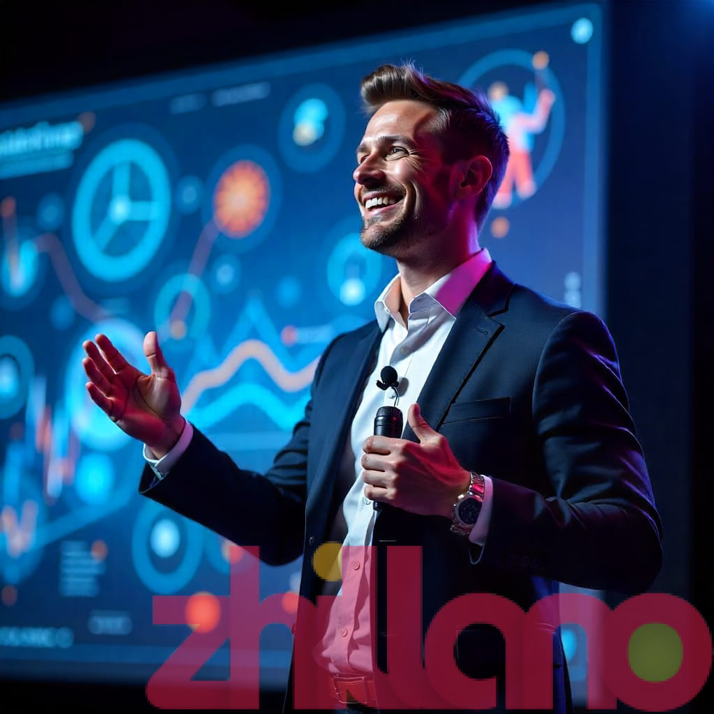 A confident and dynamic professional male character in a sharp, modern business suit, actively presenting on a stage. He is gesturing with one hand towards an unseen audience, while the other hand holds a sleek wireless microphone. Behind him, a large, futuristic holographic screen displays abstract data visualizations and connecting lines, suggesting innovation and technology. His expression is engaging and authoritative. The lighting is focused and professional, highlighting the character.